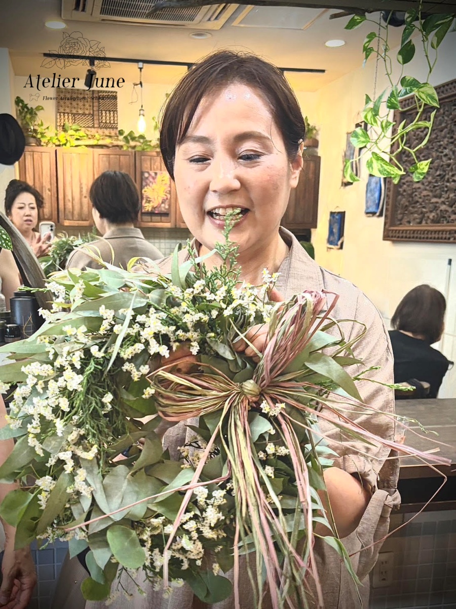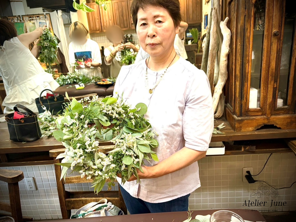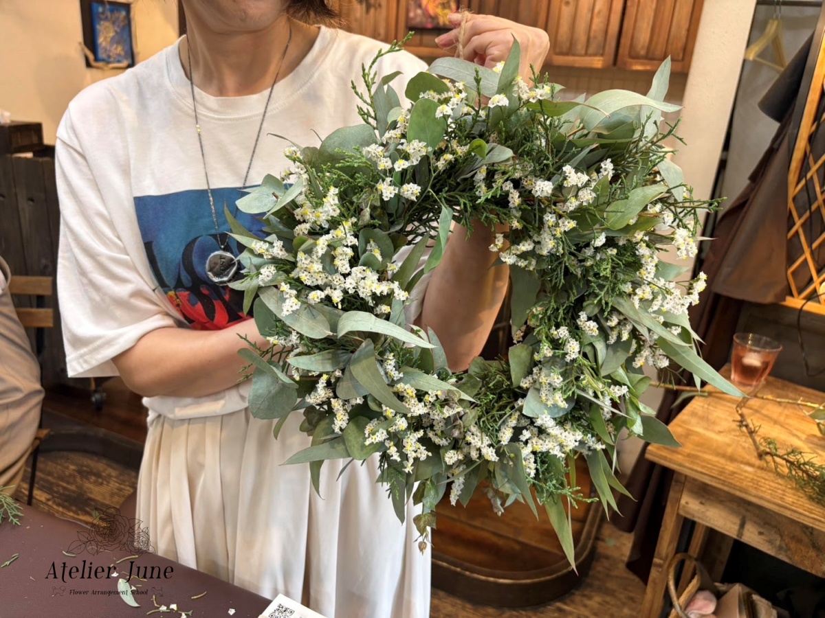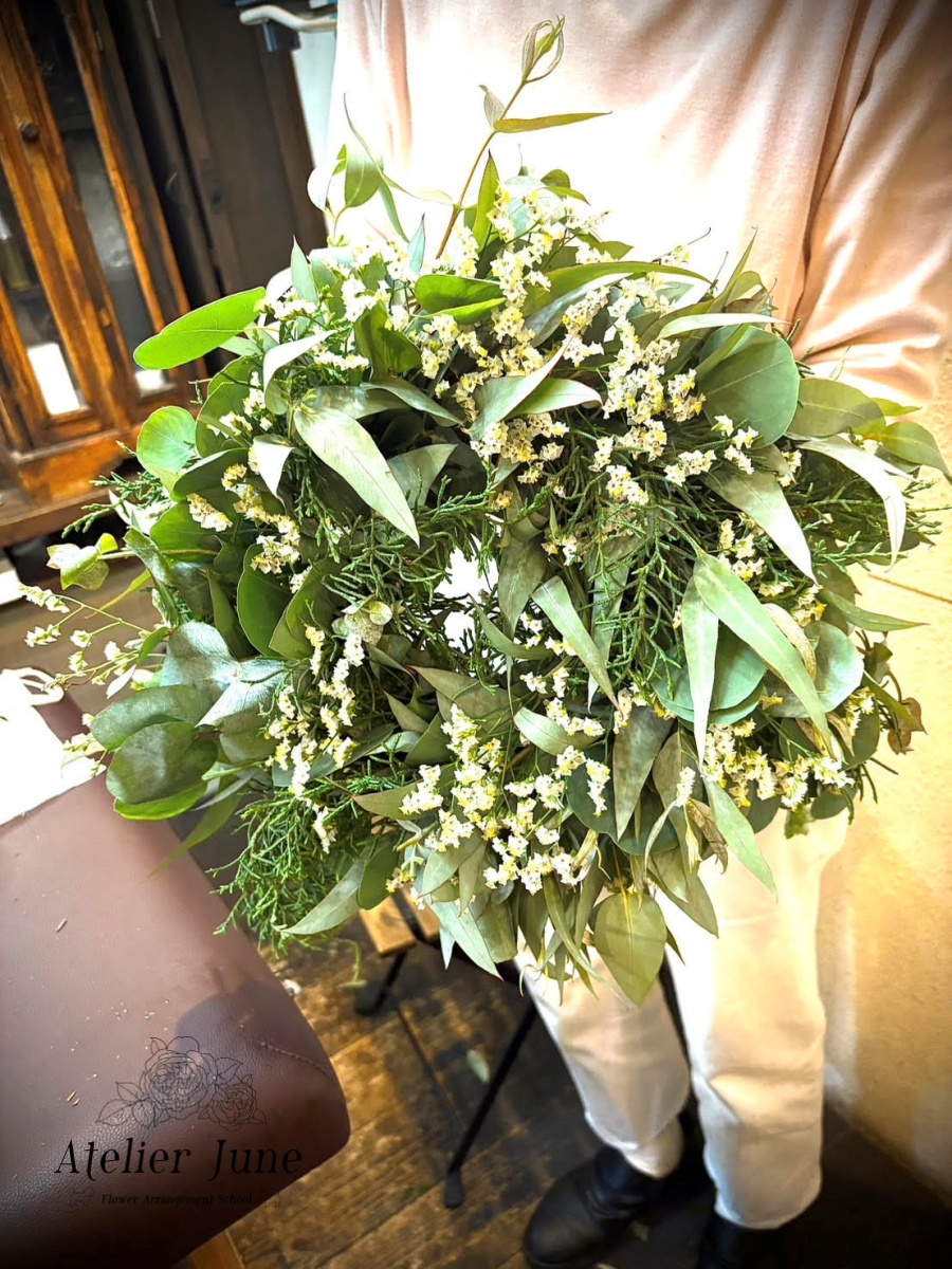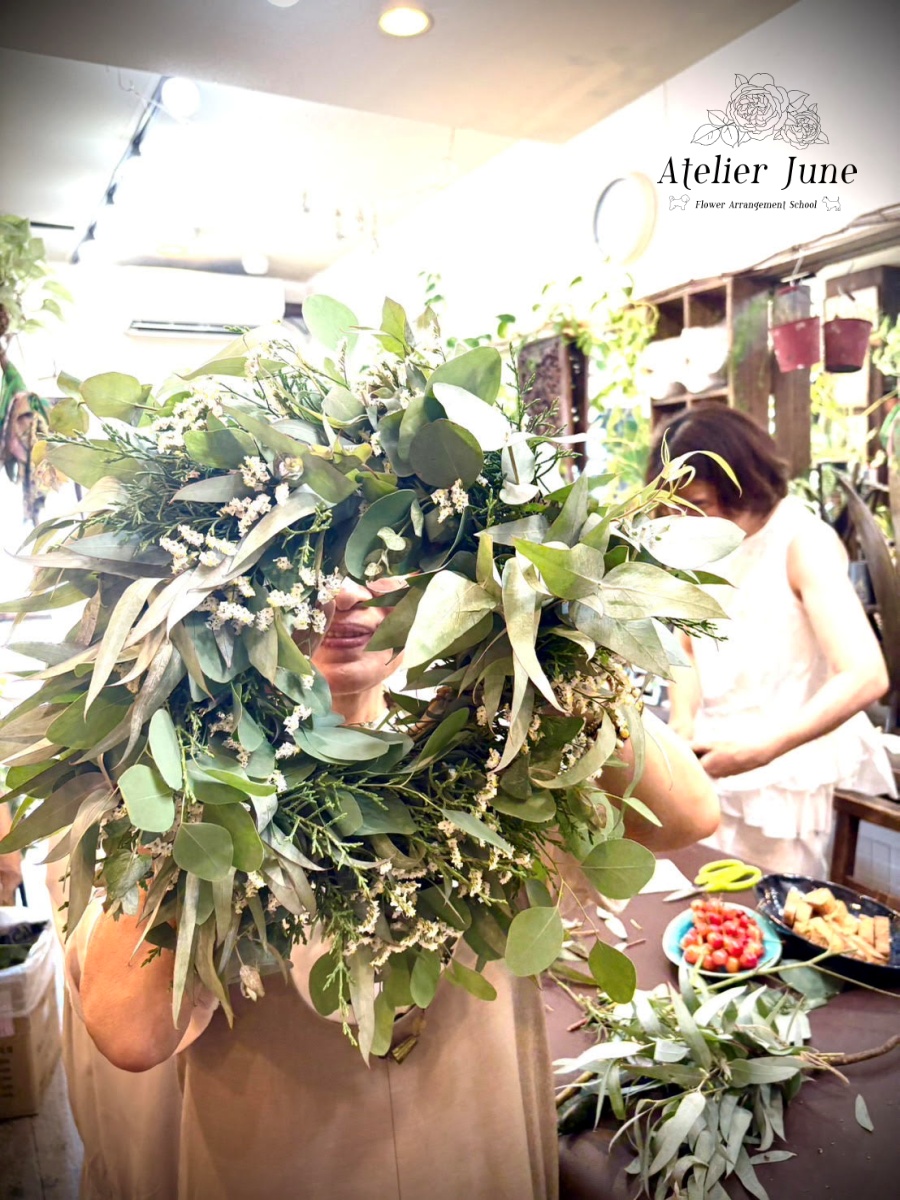 レッスン内容:ドライフラワーになるフレッシュグリーンリース+1ドリンク