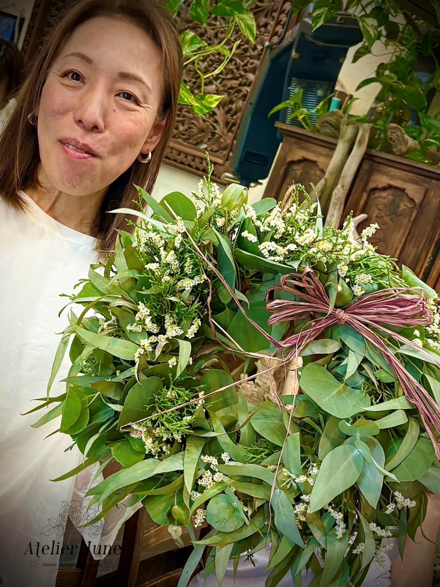 保護犬チャリティーイベントレッスン、ドライフラワーになるフレッシュグリーンリース