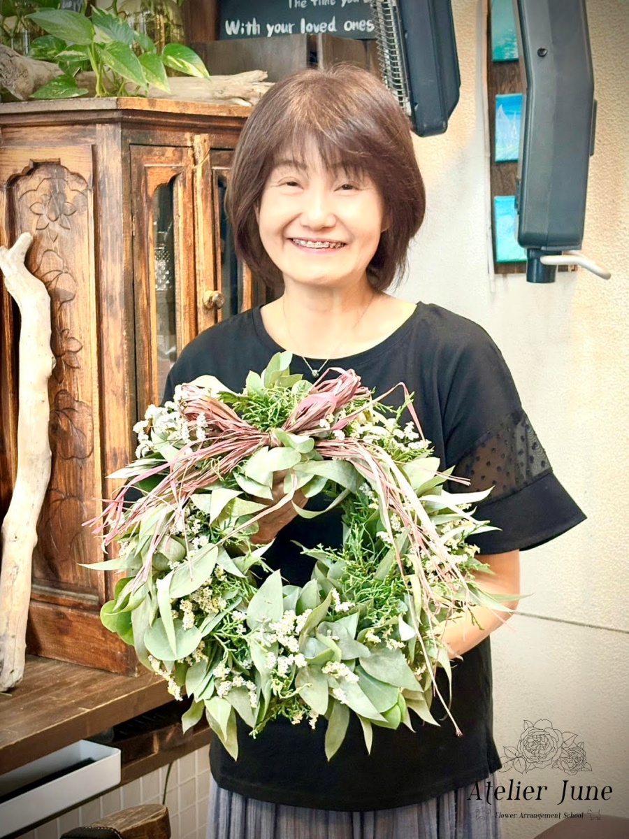 *初夏のさわやかなグリーンをメインにして、ドライフラワーになる花材を使って長く楽しんでいただけるフレッシュグリーンリース